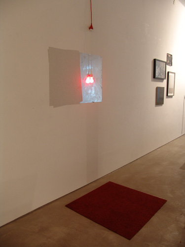 "Variation Red" Raufasertapete, Silbertapete, Fliesenteppich rot, Lampe mit roter Glühbirne